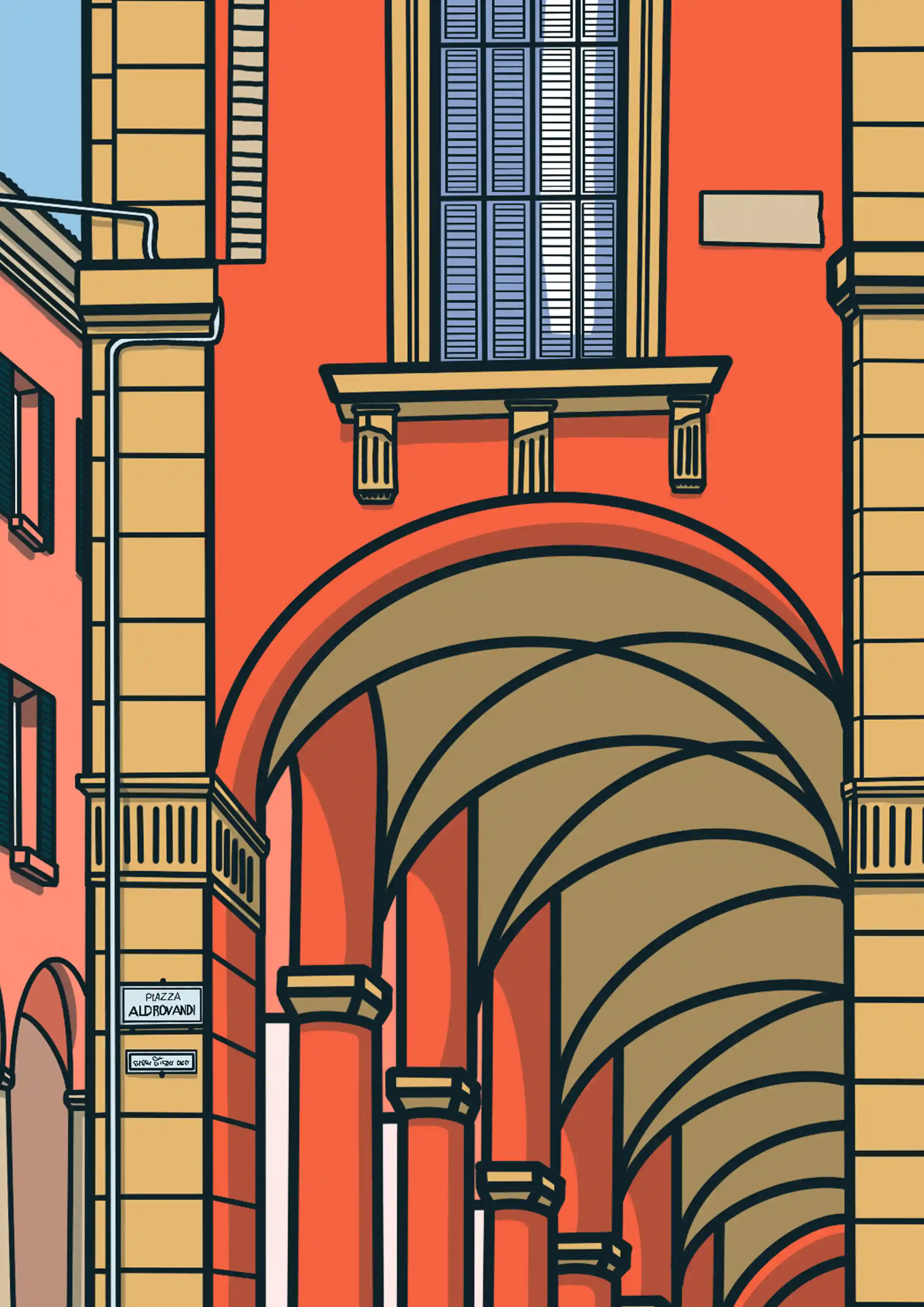 This illustration was inspired by a peaceful walk through Piazza Aldrovandi in Bologna — a place where everyday life flows gently under the arches. The warm terracotta walls, elegant porticoes, and soft morning light created a rhythm that felt both timeless and intimate.
